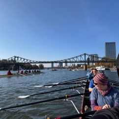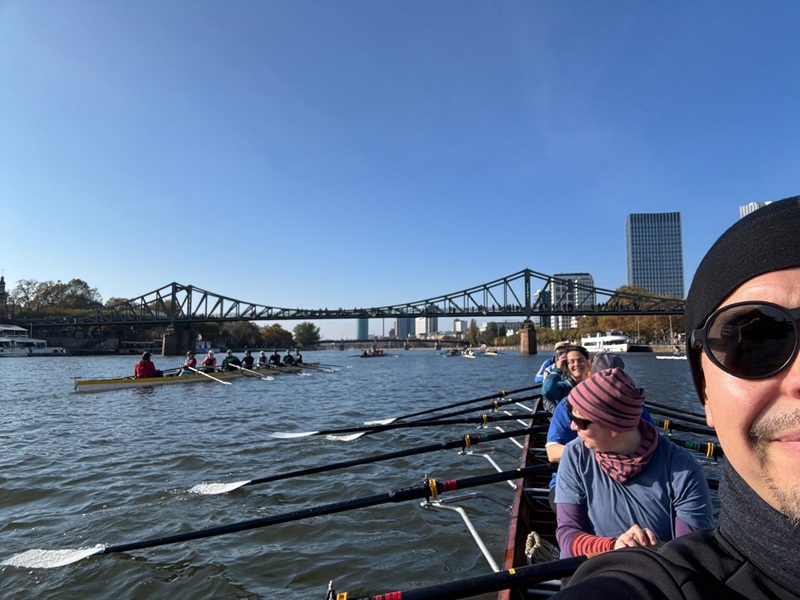 Pünktlich um 10 Uhr machten sich 9 unerschrockene Ruderer, in unseren doch in die Jahre gekommenen 8er, fertig zum ablegen. Auf dem Main sammelten sich jetzt schon mehrere 8er und diverse andere Boote im Ruderdorf und so kurz vor 11 Uhr ruderten wir alle zum eisernen Steg.